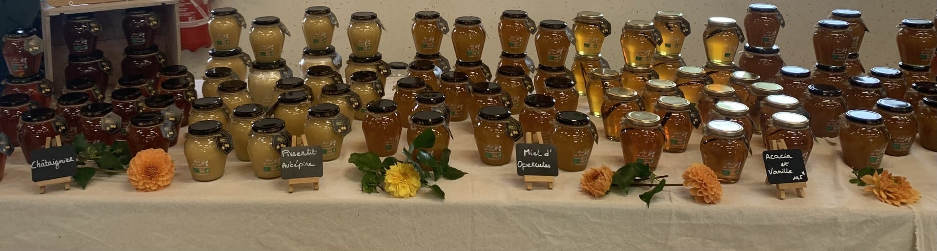 Apiculteurs récoltant différents miels suivant les saisons : printemps, acacia, toutes fleurs, châtaignier, pissenlit, forêt, crémeux … Miels en pots et en vrac, confiseries, alcoolat de propolis, coffrets cadeaux, bonbons.