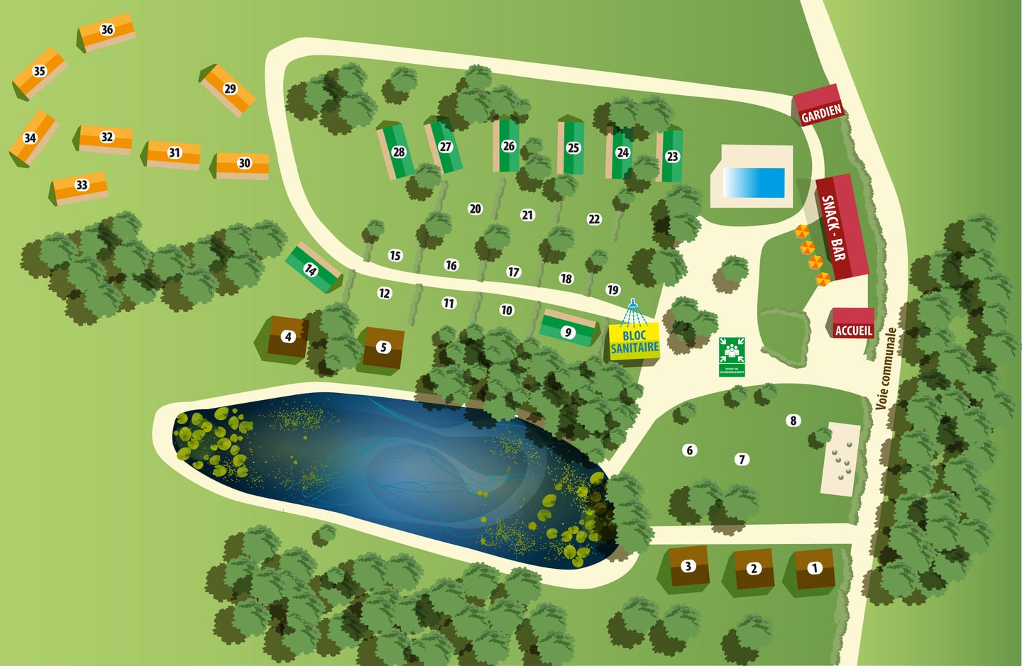 Avec ses 36 emplacements spacieux, le camping vous invite à poser vos valises dans un décor vallonné, bordé d’une végétation luxuriante. Plongez dans notre piscine pour une pause rafraîchissante ou laissez-vous bercer par la quiétude de notre étang poissonneux, parfait pour une parenthèse au bord de l’eau.