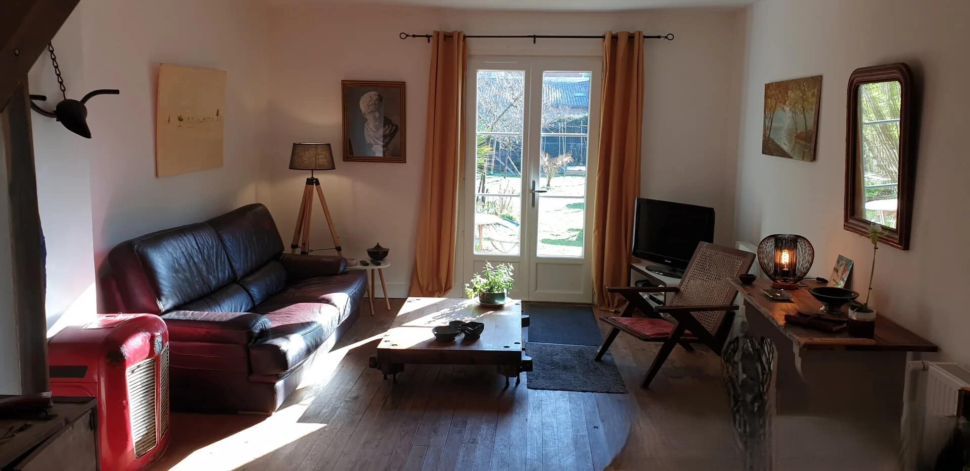 La pièce à vivre comprend le salon, la salle à manger (TV + Wifi) et une cuisine équipée (lave-vaisselle, réfrigérateur congélateur, four, four à micro-ondes, plaque de cuisson, bouilloire, grille-pain).