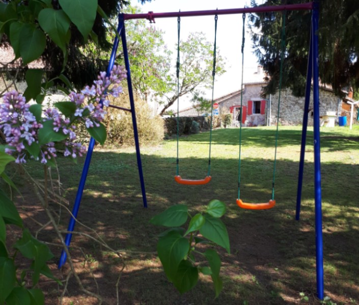 Jardin clos avec balançoire, salon de jardin, barbecue.