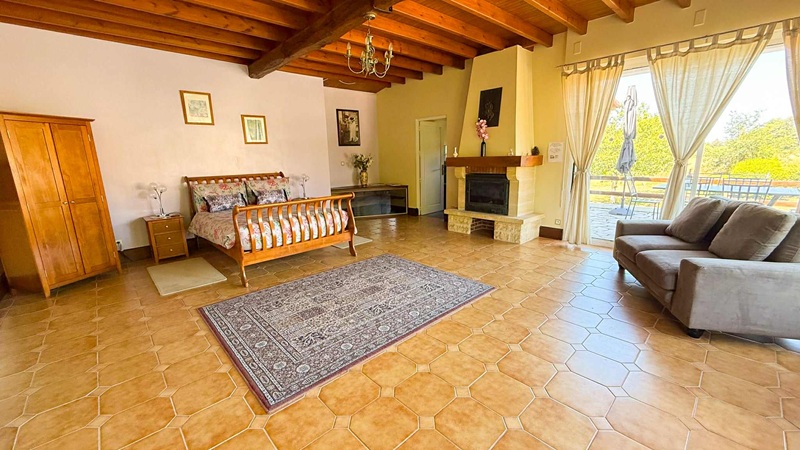 Un escalier en colimaçon en bois mène à l’étage supérieur où se trouvent un salon et deux chambres.