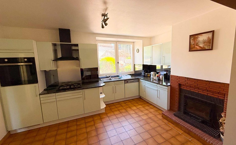 Le rez-de-chaussée comprend une cuisine bien équipée, un coin repas avec une table en chêne et six chaises, une chambre deux lits avec placards intégrés et une salle d’eau avec lavabo et wc.