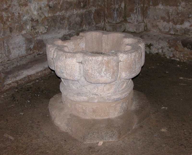 Les fonts baptismaux, composés de 7 lobes côtelés, sont taillés dans un seul bloc de granit (XIIe siècle).